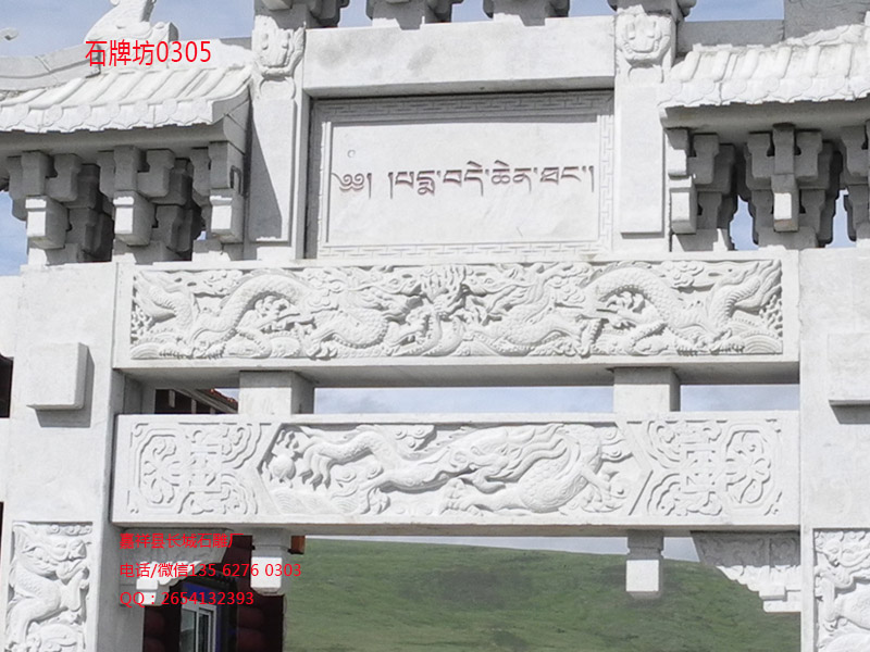 上面的一門三樓石牌坊建筑,安裝在四川省甘孜洲白玉縣昌臺區(qū)亞青寺,用漢白玉石材精心雕刻而成,由專業(yè)石牌坊廠家——嘉祥縣長城石雕廠提供。