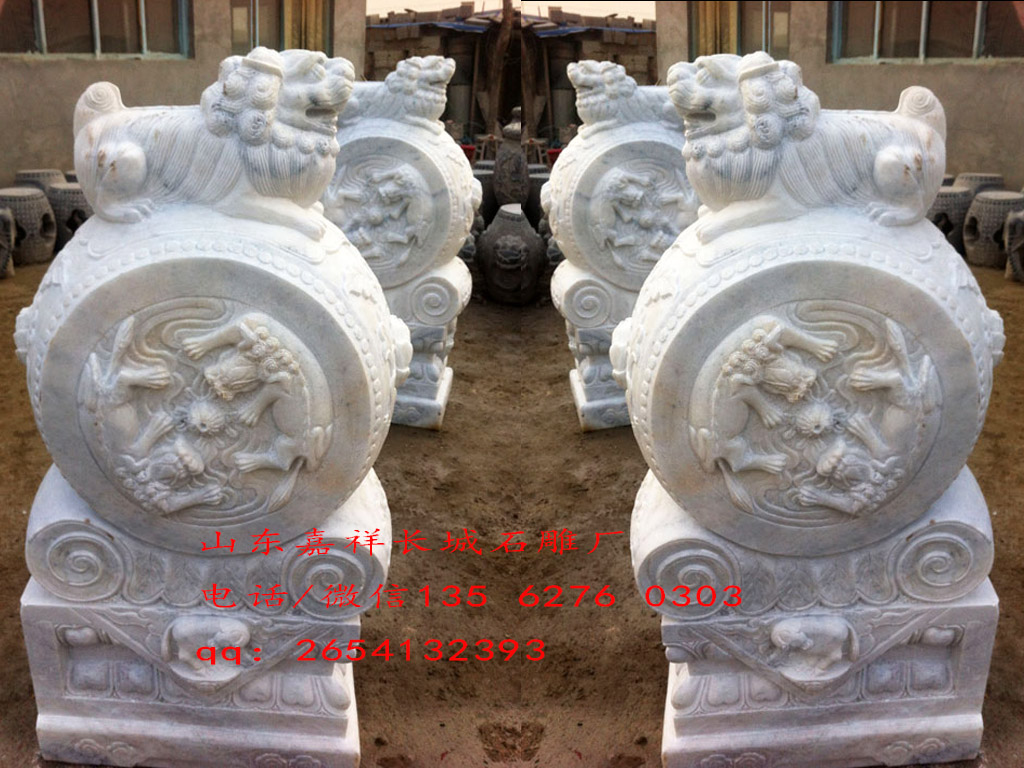 門口抱鼓石俗稱門鼓石,一般擺放在大門門口兩側(cè),其形狀與石鼓相類似而得名,是兩塊經(jīng)過雕琢的石材構(gòu)件。抱鼓石還有多種名稱,如石鼓、門墩、門鼓石等等。從嘉祥長城石雕廠提供的抱鼓石圖片來看,抱鼓石雕刻一般由鼓身和須彌座組成。